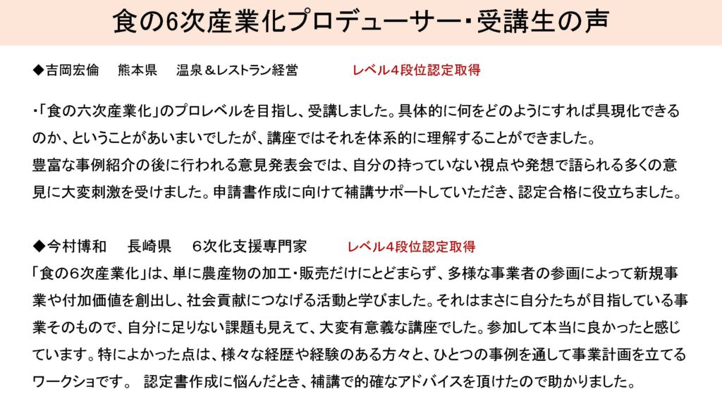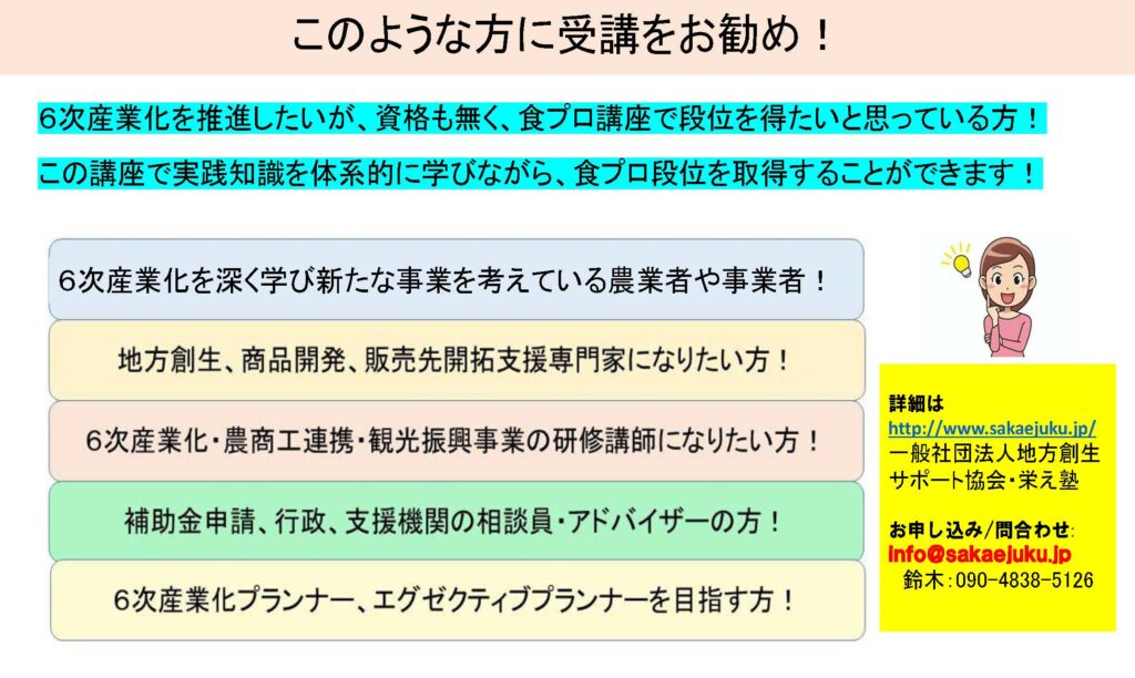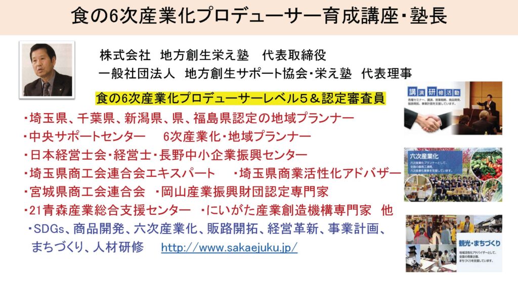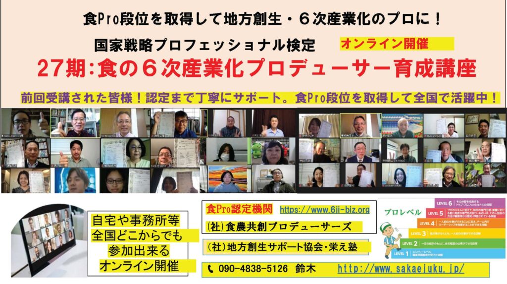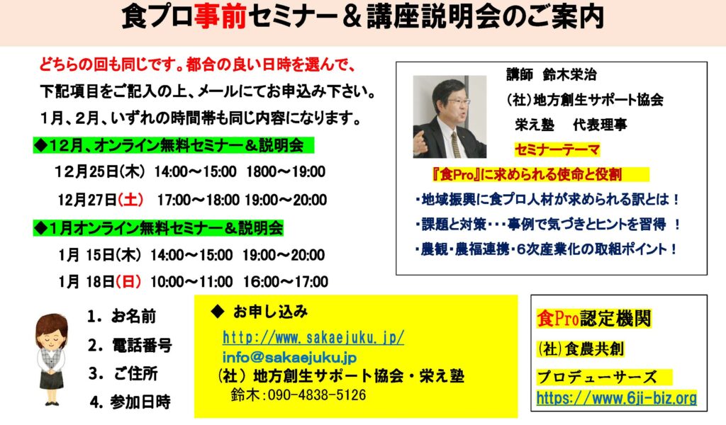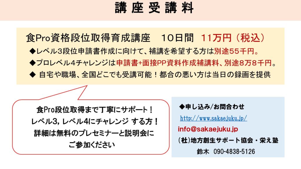 食Pro.育成講座 無料プレセミナー説明会 2022年3月22日 最終更新日時 : 2025年12月10日 栄え塾 栄え塾「食の六次産業化プロデューサー」育成講座(第27期)2026年2月10日より開催 セミナー申込みフォーム お申込みはこちらをクリック お問い合わせフォームよりお申込み下さい。 受講者の声をホームページで見る こちらをクリック すごく参考になります!!
