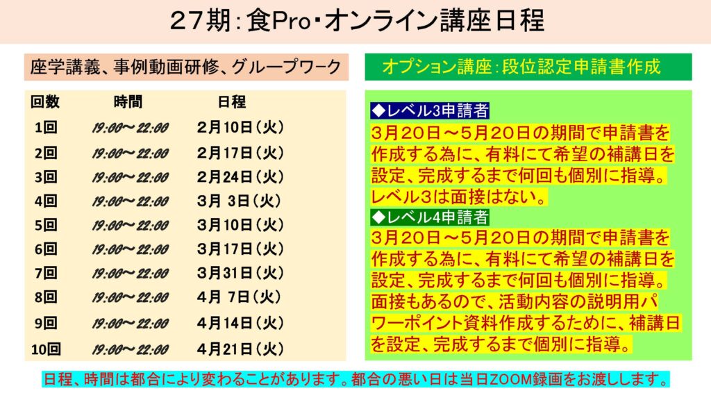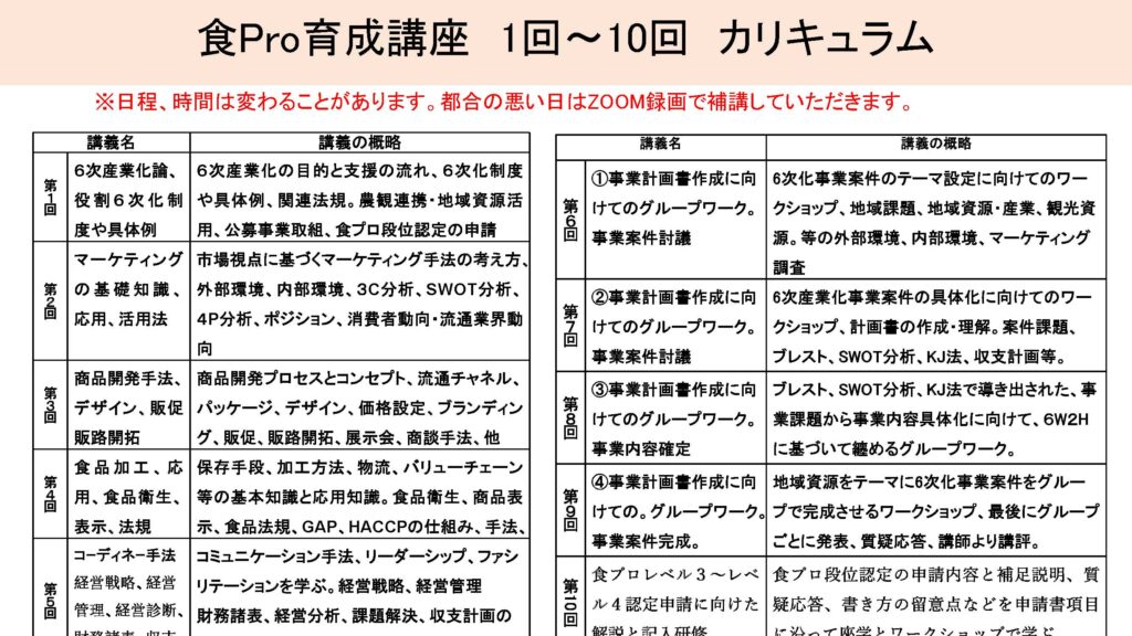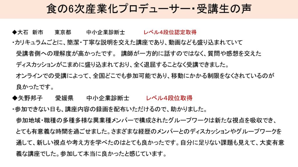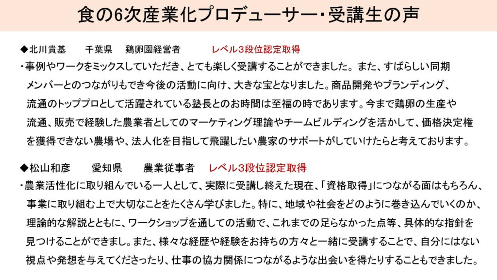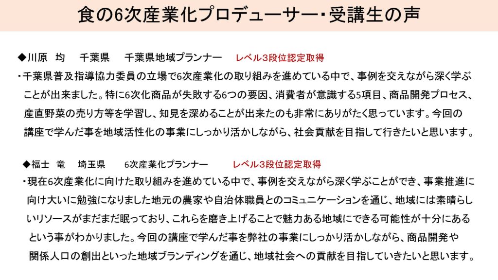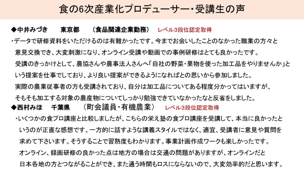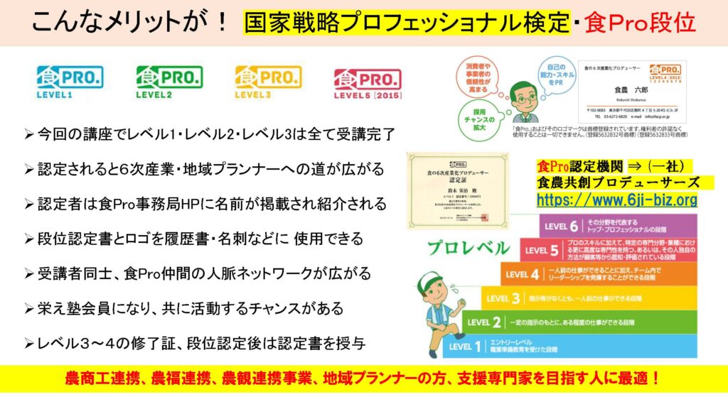 食Pro.育成講座 無料プレセミナー説明会 2022年3月22日 最終更新日時 : 2025年12月10日 栄え塾 栄え塾「食の六次産業化プロデューサー」育成講座(第27期)2026年2月10日より開催 セミナー申込みフォーム お申込みはこちらをクリック お問い合わせフォームよりお申込み下さい。 受講者の声をホームページで見る こちらをクリック すごく参考になります!!