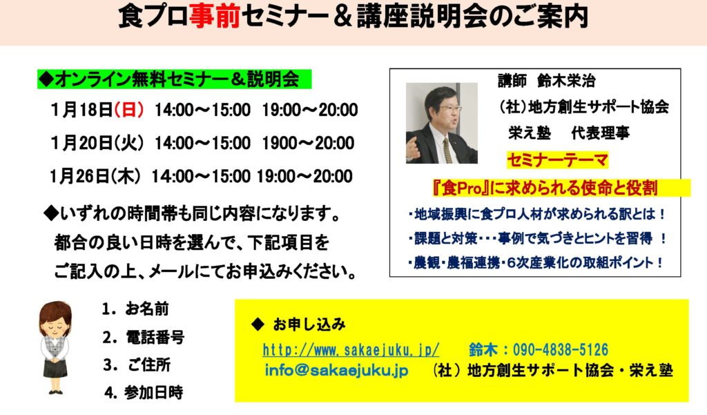 食Pro.育成講座 無料プレセミナー説明会 2022年3月22日 最終更新日時 : 2026年1月9日 栄え塾 栄え塾「食の六次産業化プロデューサー」育成講座(第27期)2026年2月10日より開催 セミナー申込みフォーム お申込みはこちらをクリック お問い合わせフォームよりお申込み下さい。 受講者の声をホームページで見る こちらをクリック すごく参考になります!!
